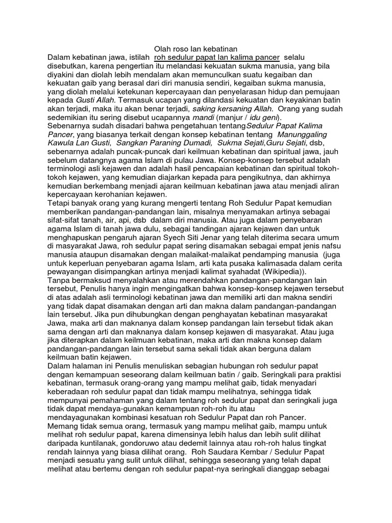 Skripsi thesis, UIN Sunan Kalijaga Yogyakarta. Di dalam Abad pertengahan ilmu pengetahuan lebih kepada hal-hal dengan abstrak serta didominasi oleh Gereja, kemudian pada zaman renaisans ilmu pengetahuan mengalami perkembangan dengan munculnya faham humanisme (mengandalkan manusia sebagai pusat segala-galanya) dari sini awal lahimya aliran rasionalisme yang dipelopori oleh Rene Descartes, aliran ini menganggap bahwa sumber pengetahuan dengan mencukupi dan yang bisa dipercaya adalah rasio (akal). Aliran tersebut kemudian diikuti oleh lahimya aliran empirisme yang dipelopori oleh John Locke, aliran ini menilai bahwr sumber pengetahuan ialah pengalaman (empiri) baik itu pengalaman batiniah maupun lahiriyah. Kedua jalan tersebut tumbuh dengan pesat dan menyebabkan lahimya Sekularisasi di jagat Barat, lalu dari sini timbul pertanyaan bagaimanakah ilmu pengetahuan di dunia Timur khususnya dalam Jawa dan penulis menjemput seorang tokoh Jawa buat diteliti tentang konsep ilmunya serta apakah ia seorang filosof & karya mengenai ilmu wawasan bisa dimasukan kedalam filsafat ilmu karena orang Jawa biasanya identik dengan mistiknya, tokoh itu adalah Ki Ageng Suryomentaram. Pendekatan dengan penulis gunakan dalam penulisan skripsi ini adalah pendekatan historis faktual, karena dengan dikaji berbentuk aspek biografis. Untuk melengkapi data yang diperlukan penulis menggunakan metode sebagai berikut: Pertama, teknik pengumpulan keterangan, penulis mengumpulkan data-data daripada buku Ki Ageng Suryomentaram dan mencari skripsi yang membahas tentang Ki Ageng Suryomentaram, serta konsep umum yang mendukung penulisan skripsi ini. Ke-2, teknik menyelidiki data, setelah mendapatkan data-data yang telah diperlukan pada penulisan skripsi ini, penulis mencoba untuk mengolah datadata tersebut biar dapat dipahami dengan jelas, untuk mengolah data-data ini penulis menggunakan Teknik Uraian, disini penulis menguraikan serta mendeskripsikan konsep pemikiran Ki Ageng Suryomentaram. Teknik Interprestasi, dengan teknik ini penulis mencoba untuk menyelami, menangkap arti & nuansa dengan dimaksud sama tokoh, serta terakhir penulis menggunakan Teknik Analisa, disini penulis berusaha untuk memisahkan, membedakan serta melihat nuansa yang dikandung di di pemikiran itu agar nanti ada keteraturan dalam penulisan skripsi itu. Tujuan daripada penulisan skripsi ini adalah Pertama, menambah khasanah kepustakaan ilmu filsafat. Kedua, mendapatkan informasi akan halnya konsep ilmu yang ditawarkan oleh Ki Ageng Suryomentaram. Ketiga, mau melestarikan kultur Bangsa sendiri, khususnya dengan berkenaan dengan ajaran-ajaran orang2 Timur (Bangsa Indonesia). Hasil dari penulisan skripsi itu adalah mau mengetahui bagaimanakah konsep ilmu pengetahuan dengan ditawarkan oleh Ki Ageng Suryomentaram dengan terdapat di bukunya, juga apakah dengan menunjukan bahwa Ki Ageng Suryomentaram itu seorang filosof dalam konteks ilmu pengetahuan.